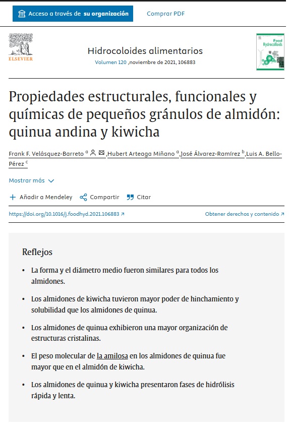 Propiedades estructurales, funcionales y químicas de pequeños gránulos de almidón: quinua andina y kiwicha.