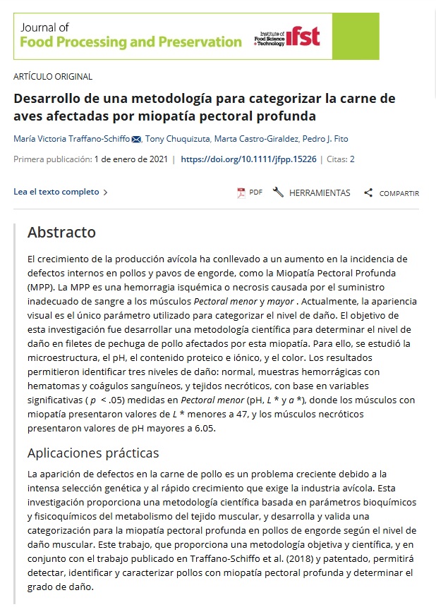 The growth of poultry production has led to an increase in the incidence of internal defects in chicken and turkey broilers, such as Deep Pectoral Myopathy (DPM). DPM is an ischemic hemorrhage or necrosis caused by the inadequate blood supply of Pectoralis minor and major muscles. Currently, visual appearance is the only parameter used to categorize the damage level. The aim of this research was to develop a scientific methodology to determine the level of damage in poultry breast tenders affected by this myopathy. For this purpose, microstructure, pH, protein and ion contents, and color were studied. Results allowed identifying three damage levels: normal, hemorrhagic samples with hematomas and blood clots, and necrotic tissues, based on significant variables (p < .05) measured in Pectoralis minor (pH, L* and a*), where muscles with myopathy presented L* values lower than 47, and necrotic muscles presented pH values higher than 6.05.