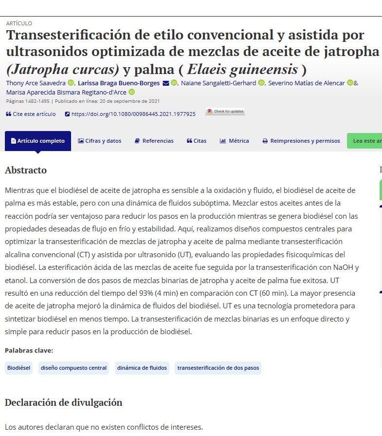 Mientras que el biodiésel de aceite de jatropha es sensible a la oxidación y fluido, el biodiésel de aceite de palma es más estable, pero con una dinámica de fluidos subóptima. Mezclar estos aceites antes de la reacción podría ser ventajoso para reducir los pasos en la producción mientras se genera biodiésel con las propiedades deseadas de flujo en frío y estabilidad. Aquí, realizamos diseños compuestos centrales para optimizar la transesterificación de mezclas de jatropha y aceite de palma mediante transesterificación alcalina convencional (CT) y asistida por ultrasonido (UT), evaluando las propiedades fisicoquímicas del biodiésel. La esterificación ácida de las mezclas de aceite fue seguida por la transesterificación con NaOH y etanol. La conversión de dos pasos de mezclas binarias de jatropha y aceite de palma fue exitosa. UT resultó en una reducción del tiempo del 93% (4 min) en comparación con CT (60 min). La mayor presencia de aceite de jatropha mejoró la dinámica de fluidos del biodiésel. UT es una tecnología prometedora para sintetizar biodiésel en menos tiempo. La transesterificación de mezclas binarias es un enfoque directo y simple para reducir pasos en la producción de biodiésel.