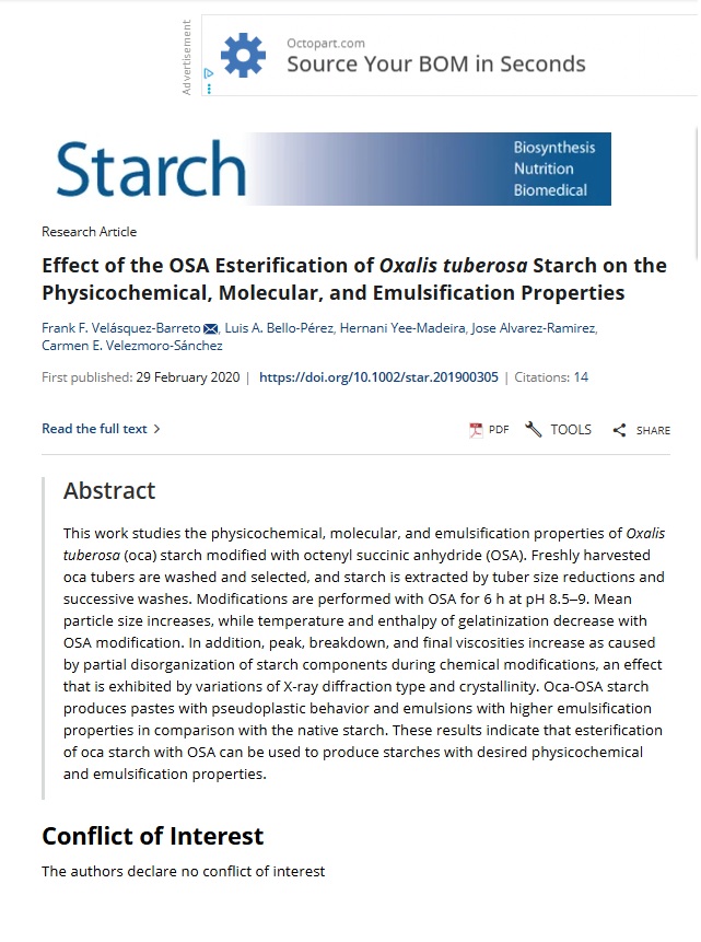 Effect of the OSA Esterification of Oxalis tuberosa Starch on the Physicochemical, Molecular, and Emulsification Properties.