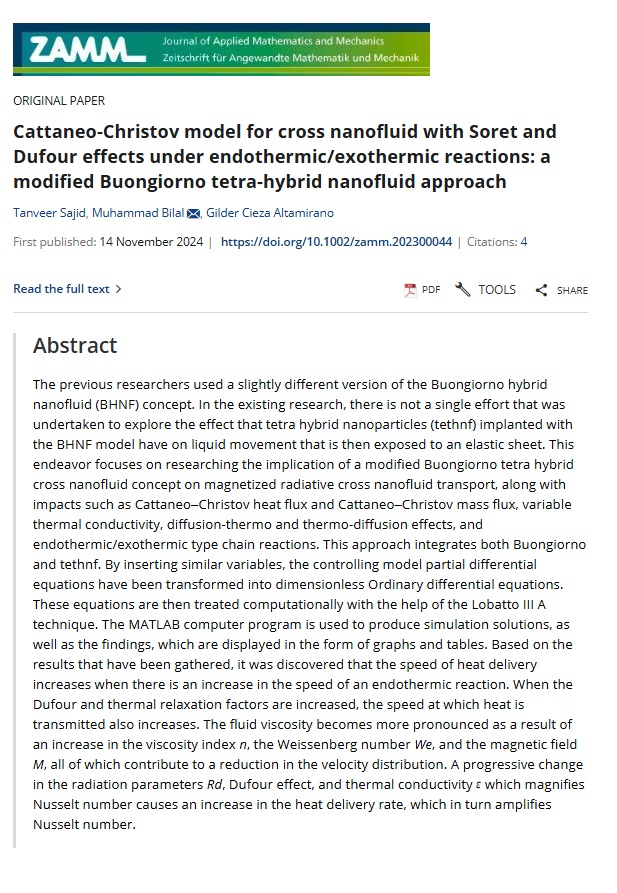 The previous researchers used a slightly different version of the Buongiorno hybrid nanofluid (BHNF) concept. In the existing research, there is not a single effort that was undertaken to explore the effect that tetra hybrid nanoparticles (tethnf) implanted with the BHNF model have on liquid movement that is then exposed to an elastic sheet. This endeavor focuses on researching the implication of a modified Buongiorno tetra hybrid cross nanofluid concept on magnetized radiative cross nanofluid transport, along with impacts such as Cattaneo–Christov heat flux and Cattaneo–Christov mass flux, variable thermal conductivity, diffusion-thermo and thermo-diffusion effects, and endothermic/exothermic type chain reactions. This approach integrates both Buongiorno and tethnf. By inserting similar variables, the controlling model partial differential equations have been transformed into dimensionless Ordinary differential equations. These equations are then treated computationally with the help of the Lobatto III A technique. The MATLAB computer program is used to produce simulation solutions, as well as the findings, which are displayed in the form of graphs and tables. Based on the results that have been gathered, it was discovered that the speed of heat delivery increases when there is an increase in the speed of an endothermic reaction. When the Dufour and thermal relaxation factors are increased, the speed at which heat is transmitted also increases. The fluid viscosity becomes more pronounced as a result of an increase in the viscosity index n, the Weissenberg number We, and the magnetic field M, all of which contribute to a reduction in the velocity distribution. A progressive change in the radiation parameters Rd, Dufour effect, and thermal conductivity mathematical equation which magnifies Nusselt number causes an increase in the heat delivery rate, which in turn amplifies Nusselt number.